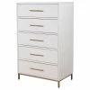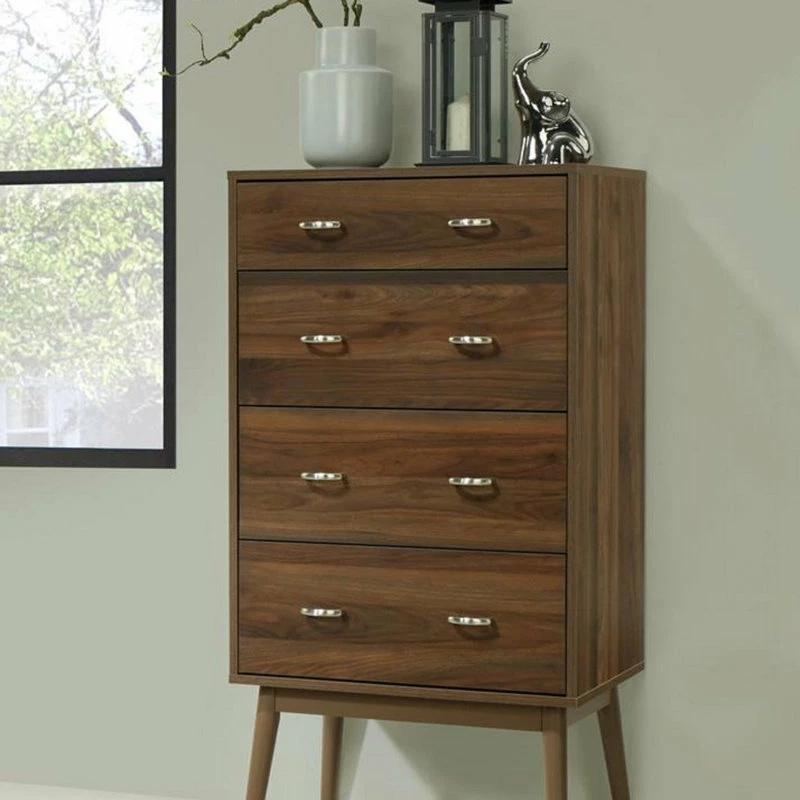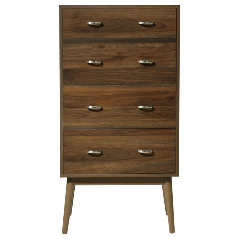 Montage 4 Drawer Mid Century Modern Chest. This stylish 4 drawer Chest is an excellent addition for every home and will giving you that added elegance. This finely crafted product combines style and function at an affordable price. Drawer fronts are accented with brushed metal pulls, metal drawer glides, and is finished with a durable espresso laminate. The uniquely designed tapered legs are made of solid wood for added durability. Clean with a dry non abrasive cloth. Comes ready to assemble with the necessary hardware and step-by-step instructions.Features