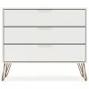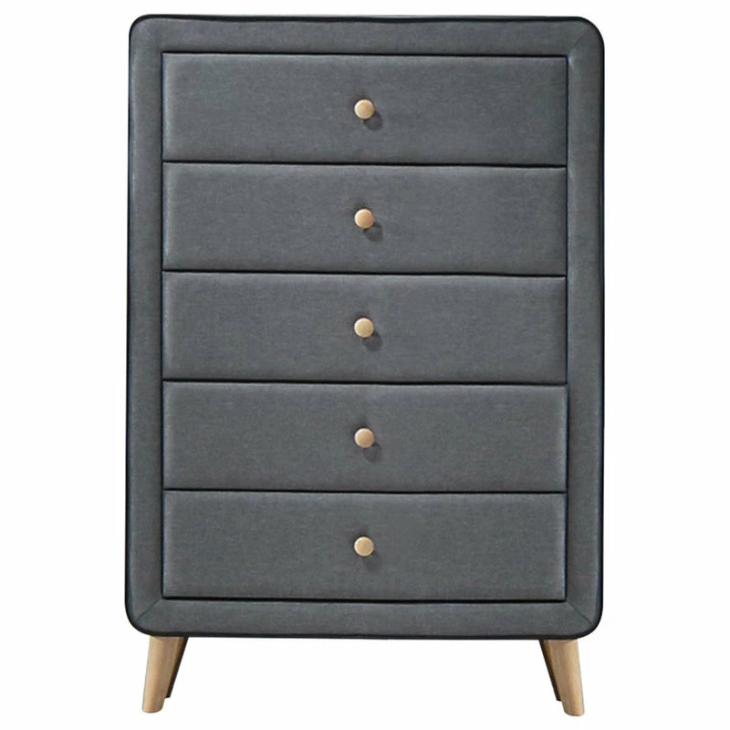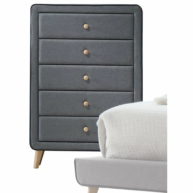 The Valda chest in light gray fabric finish and and black welt trim padded. with 5 spacious drawers will meet all of your bedroom storage needs, with space for clothing and linen. The chest is complemented by wood tapered leg.