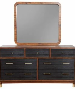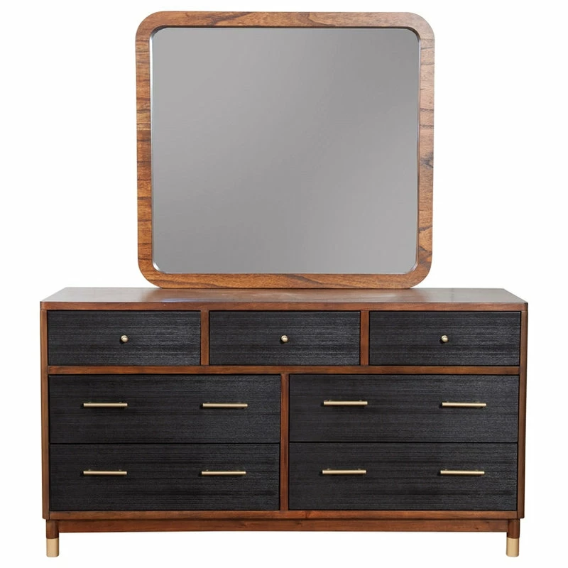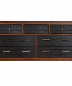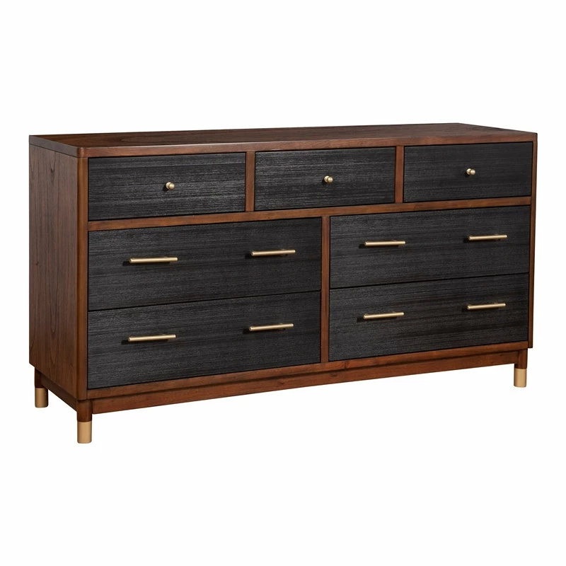 The Belham Dresser stands out in any bedroom. With 7 drawers, this piece provides ample storage. Distinctive rattan drawer fronts are complimented by gold hardware. The case is made from Mahogany solids and veneers, finished in rich dark walnut. The gold metal feet give the piece a nice transitional feel. Coordinates with other pieces from the Alpine Furniture Belham bedroom collection sold separately.