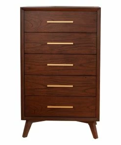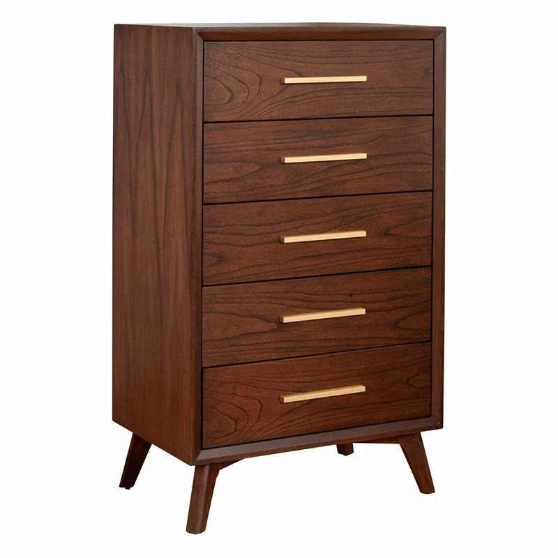 The streamlined design of the Gramercy mid-century 4 drawer chest creates a stunning focal point in your space. The clean lines, and angled legs combine to form a signature look to this classic piece. The Gramercy collection pieces are structurally sound and constructed with Mahogany wood solids & veneer in a classic Walnut (Brown) finish. The Gramercy collection hints at subtle refinement, without overpowering your current decor. Drawers feature English Dovetail Drawer Construction, felt lined top drawer to protect your valuables as well as metal ball bearing drawer glides The pieces in the Alpine Furniture Gramercy collection fluidly fits in with a variety of aesthetics and color schemes to compliment your bedroom setting. Coordinate with other pieces from the Gramercy bedroom collection.