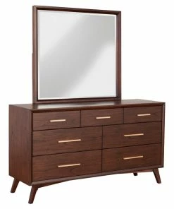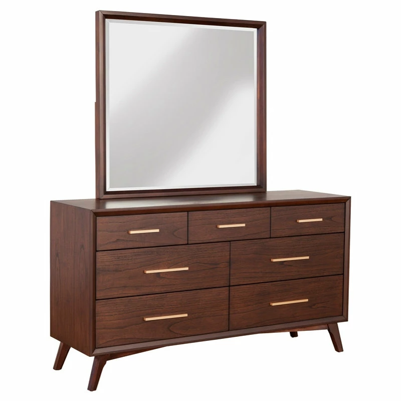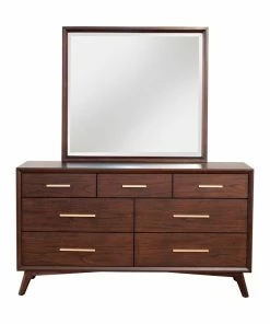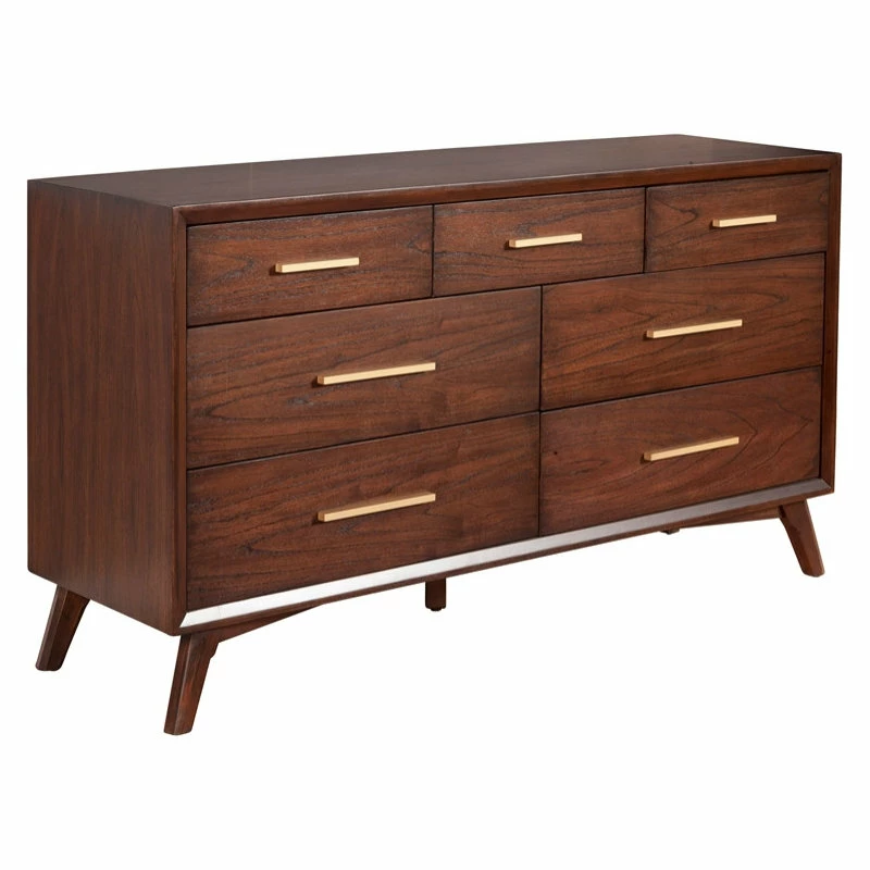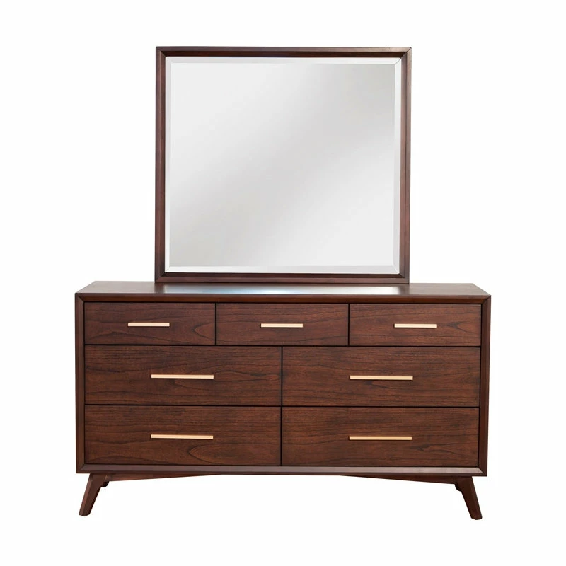 The streamlined design of the Gramercy mid-century 7 drawer dresser creates a stunning focal point in your space. The clean lines, and angled legs combine to form a signature look to this classic piece. The Gramercy collection pieces are structurally sound and constructed with Mahogany wood solids & veneer in a classic Walnut finish. The Gramercy collection hints at subtle refinement, without overpowering your current decor. Drawers feature English Dovetail Drawer Construction, felt lined top drawer to protect your valuables as well as metal ball bearing drawer glides The pieces in the Alpine Furniture Gramercy collection fluidly fits in with a variety of aesthetics and color schemes to compliment your bedroom setting. Coordinate with other pieces from the Gramercy bedroom collection.