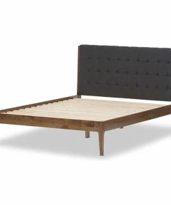 With a luxuriously fabric-covered headboard that adds an elegant touch to the solid wood frame, the Clifford bed will be a standout piece in any bedroom. With high-quality hardwoods and fabric headboards, this queen-sized, platform bed blends perfectly with modern and contemporary bedroom suites. Infusing unique designs with superior craftsmanship, the Clifford ensures that you will receive the finest quality as each item is handmade and inspected. Constructed of eco-friendly solid rubberwood in dark walnut finishing, the Clifford is upholstered in textured dark Gray fabric with modern grid-tufting and cushioning while the solid wood frame has smooth lines punctuated by sharp cornered joinery. To ensure a comfortable night’s sleep, the traditional slats of the base have been closely spaced to provide firm support that suits standard size mattresses. Made in Malaysia, the queen-size bed requires assembly.