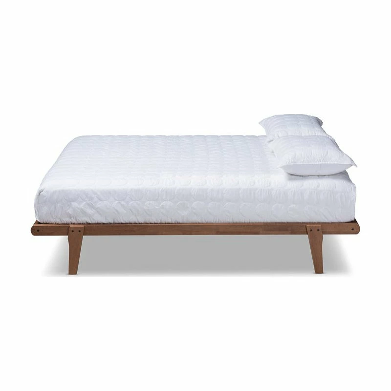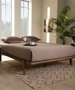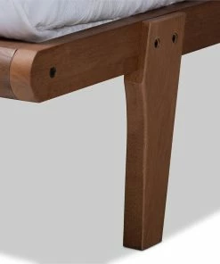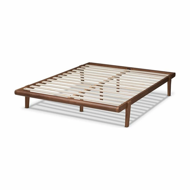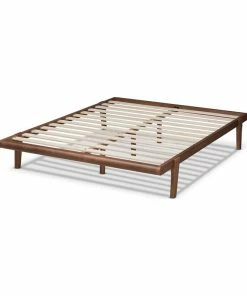 Constructed from solid rubberwood and LVL, Walnut brown finish, Slats eliminate the need for a box spring, Made in Malaysia, Assembly required, Angled legs