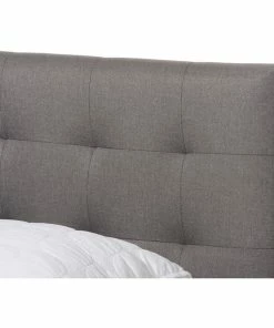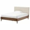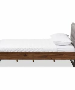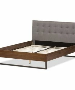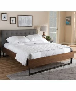 The Mitchell king size platform bed combines solid wood, metal and upholstery into a modern piece of bedroom furniture. Constructed of solid wood frame and finished in walnut Arcacia veneer, the Mitchell is built to last. The bed frame is designed to be striking and bold, while allowing the wood to float. Featuring angular industrial details, the dark bronze powder coated steel legs help to give structure and form to the piece while the upholstered headboard, overly padded and with grid-tufting design provides a comfortable leaning support for your backrest. The walnut veneered wood frame looks stunning against the metal frame while having a strong contrast against the Gray upholstered headboard. This combination makes the Mitchell platform bed an industrial icon. It will be a perfect piece of furniture for an industrial, modern or minimalist interior. Made in Malaysia, the Mitchell requires assembly.