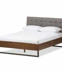 The Mitchell king size platform bed combines solid wood, metal and upholstery into a modern piece of bedroom furniture. Constructed of solid wood frame and finished in walnut Arcacia veneer, the Mitchell is built to last. The bed frame is designed to be striking and bold, while allowing the wood to float. Featuring angular industrial details, the dark bronze powder coated steel legs help to give structure and form to the piece while the upholstered headboard, overly padded and with grid-tufting design provides a comfortable leaning support for your backrest. The walnut veneered wood frame looks stunning against the metal frame while having a strong contrast against the Gray upholstered headboard. This combination makes the Mitchell platform bed an industrial icon. It will be a perfect piece of furniture for an industrial, modern or minimalist interior. Made in Malaysia, the Mitchell requires assembly.