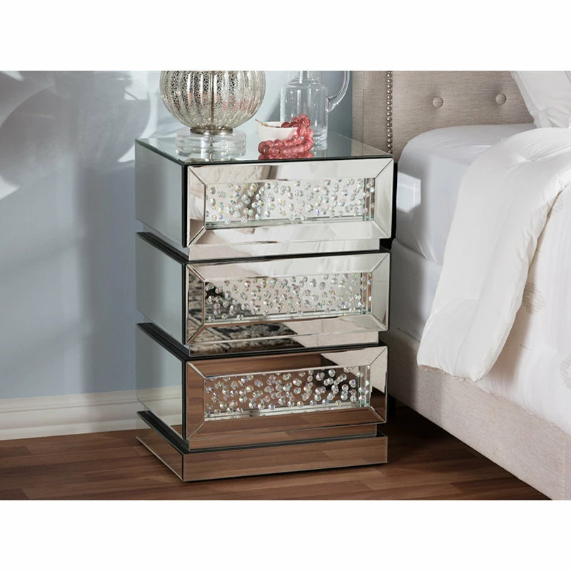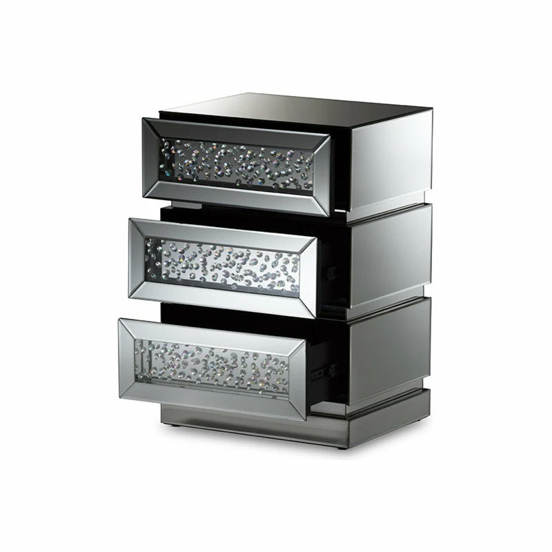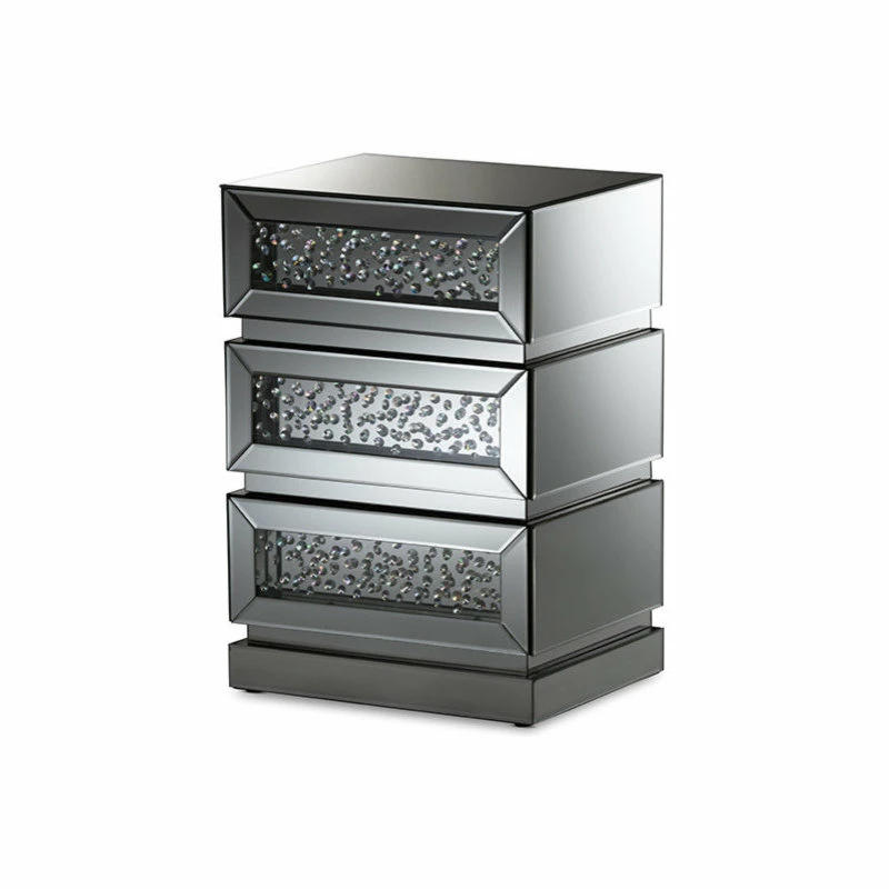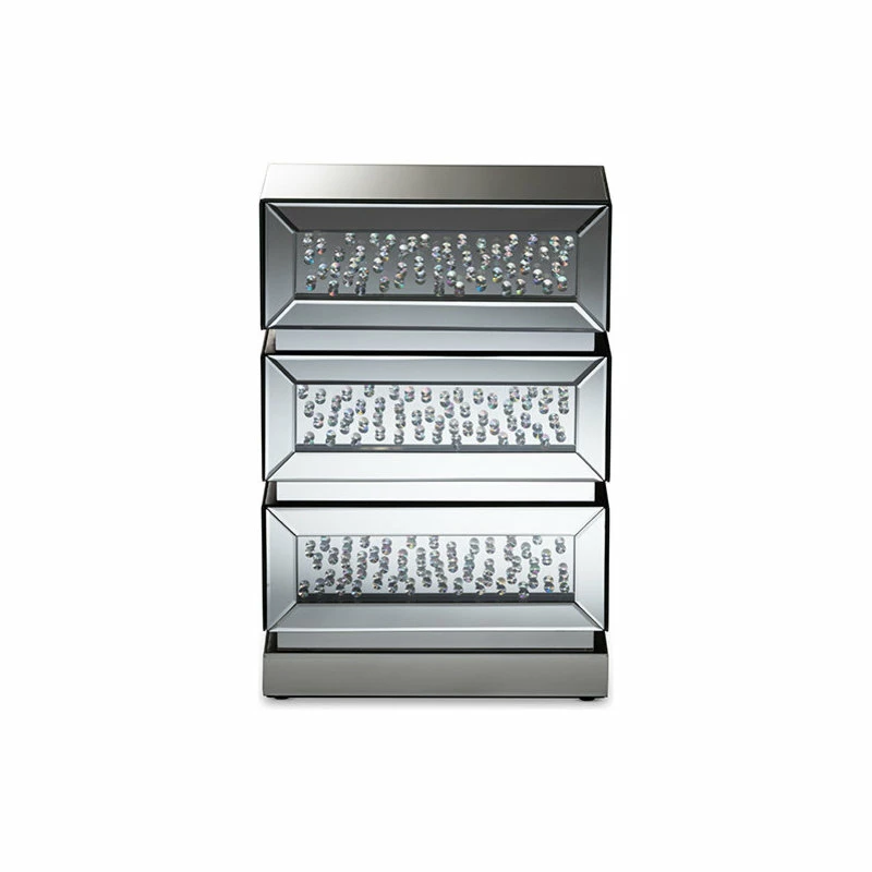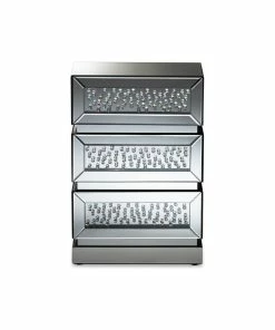 Graceful and elegant, the Sabrina mirrored 3-drawer nightstand is a stunning piece of furniture that really makes a statement and will be the focal point of any home. When the light hits, it really sparkles and adds a bit of glitz and glamour to any room in the home. Can be used as a bedside, side table or even as a telephone table for your living room or hallway, the Sabrina is constructed from wood and encased in mirrored glass with beautiful floating crystal design to the drawer fronts. Featuring three drawers for storage with black accents, the drawers come on metal runners for smooth open and close. Made in China, the Sabrina will arrive fully assembled.
