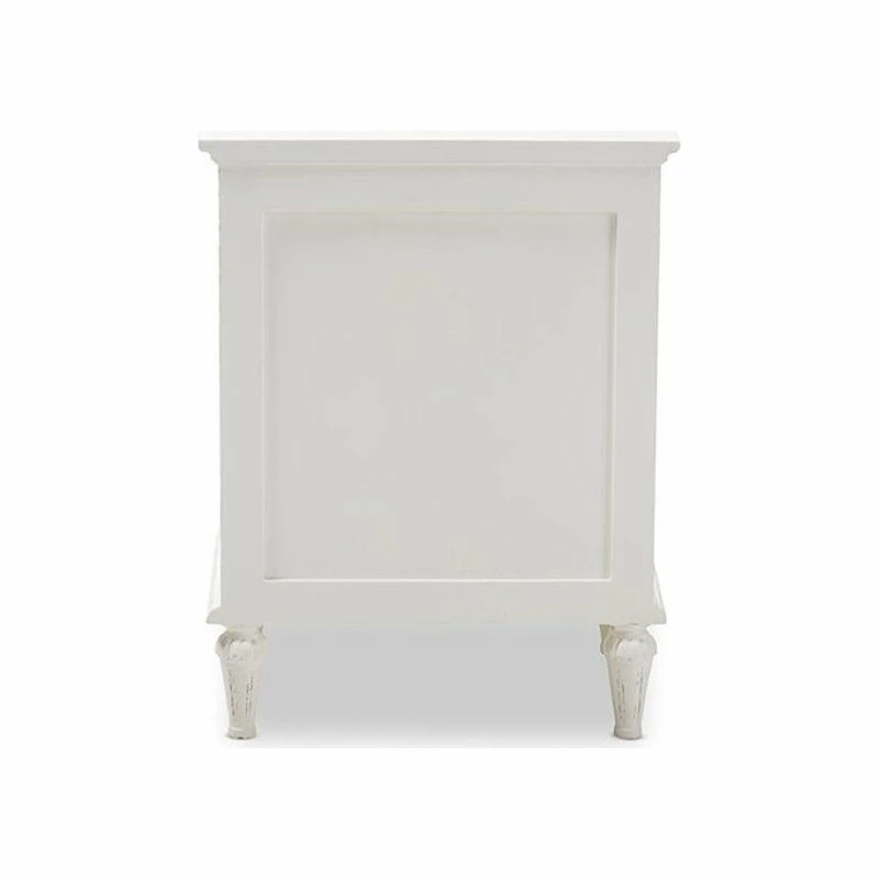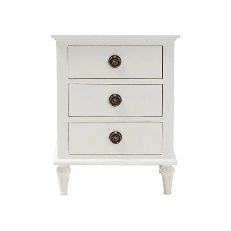 The Venezia 3-drawer nightstand is a functional and classic style piece that will instantly cozy up a bedroom space with its rustic charm. Inspired by French furniture, the Venezia is crafted from Mindi wood. Featuring whitewashed finishing and tapered legs that are fluted, bronze-plated hardware completes the look of a rustic design. Three of the drawers provide plenty of room for you to stowaway items and keep them close by. the Venezia has been built to last and is made to the highest quality design standards. Made in Indonesia, the Venezia requires legs assembly.
