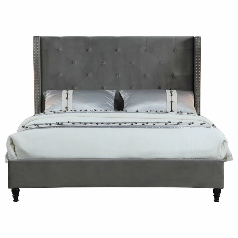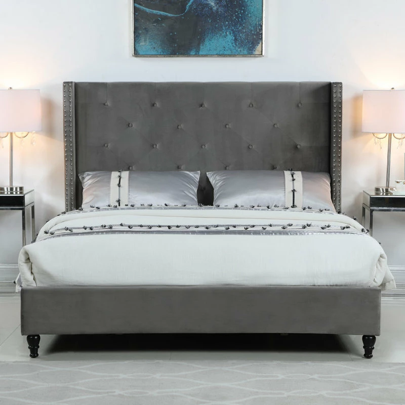 Create luxurious style and inviting comfort in any bedroom with the upholstered tufted wingback bed. Featuring a high profile head board that is upholstered in velvet and includes a wing back frame with silver nailheads. It includes wooden slats so a box spring/foundation is not required. The legs are finished in a dark rich espresso color.