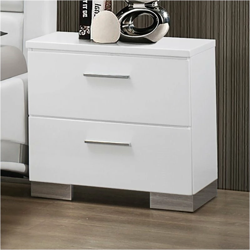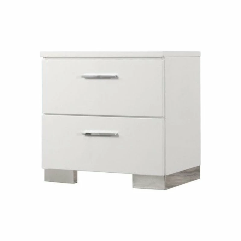 Tasteful and refined with a modern edge, this nightstand will instantly upgrade your bedroom’s decor. Coated in white polyurethane with a high-gloss finish, it exudes cool, contemporary glamour. It comes complete with two large drawers for versatile storage. High-shine chrome adorns its handles and base supports, elevating its exquisite charm. Ideal for bedrooms of all shapes and sizes, this nightstand exudes elegant versatility.