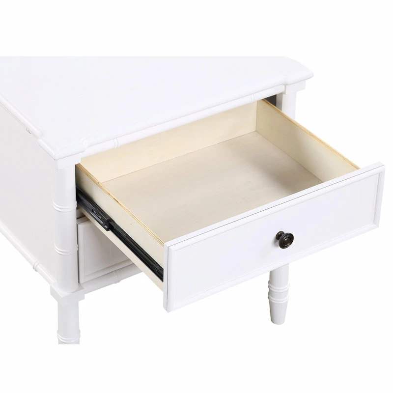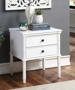 Bring a touch of the tropics to any room in your home with the Ellison nightstand. Your choice of midnight blue, white, or dove gray finish make it easy to add storage and style to any space. Two drawers offer corner block construction with side mounted roller bearing full extension drawer glides. A shaped top, framed drawer panels and elegantly carved bamboo style wooden legs make this table an easy addition to your bedroom, living room, entryway or office.