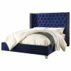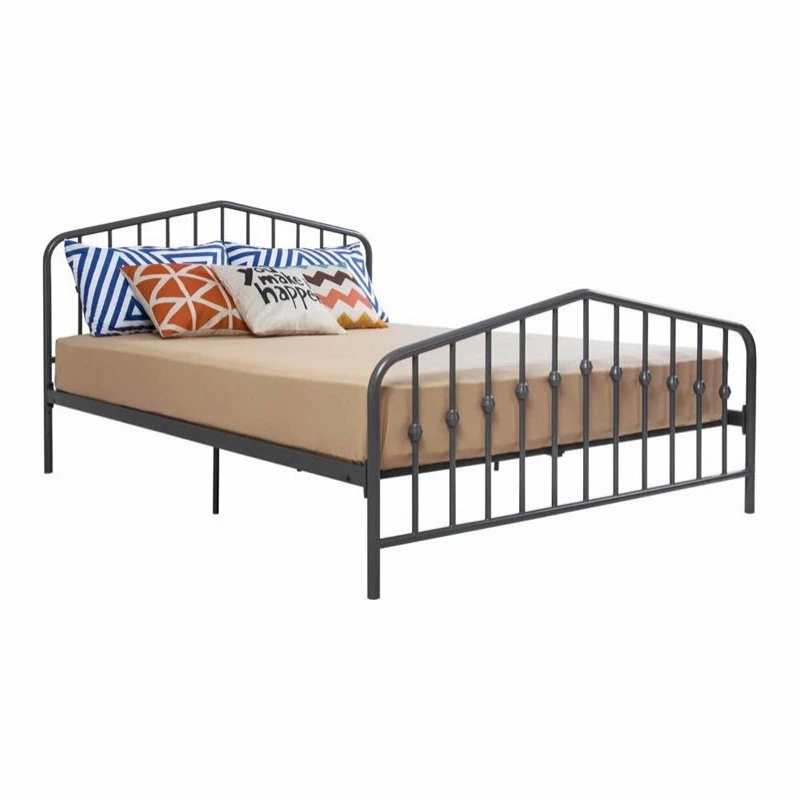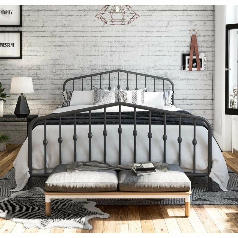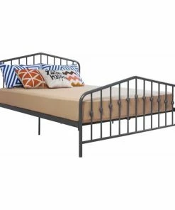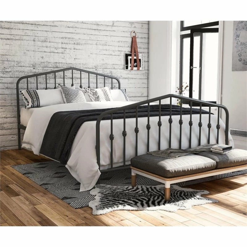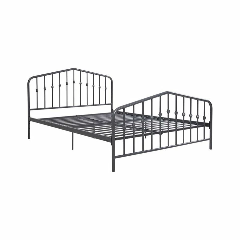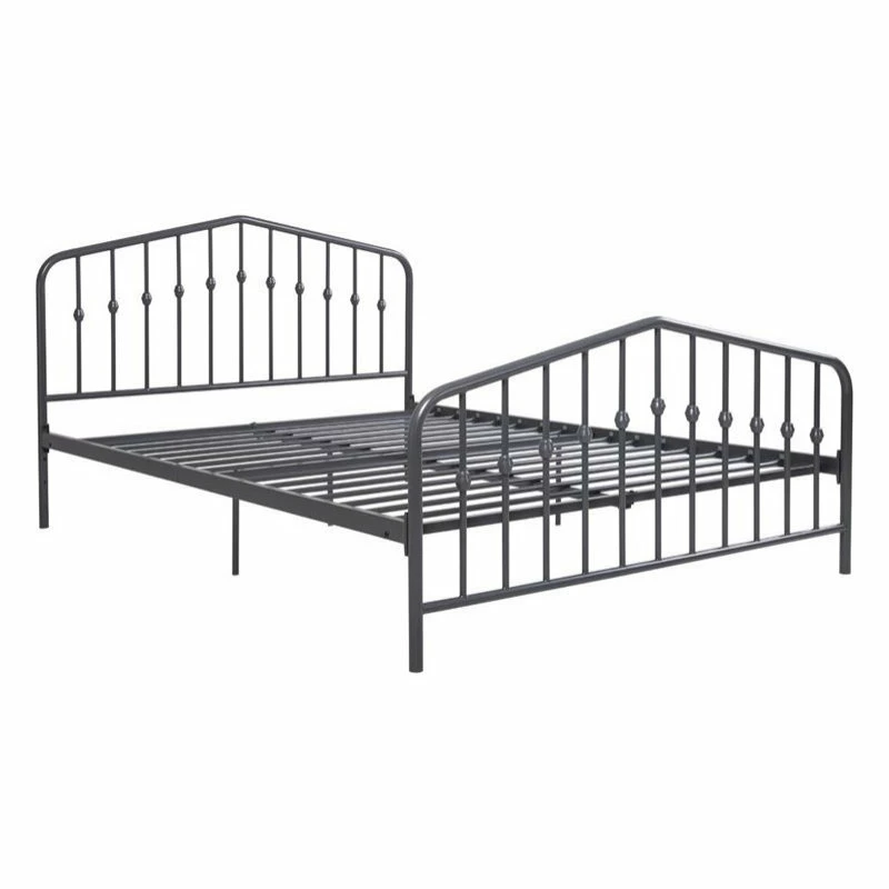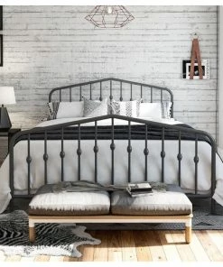 - Industrial modern design. Headboard and footboard feature decorative round finial posts
