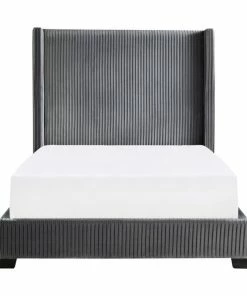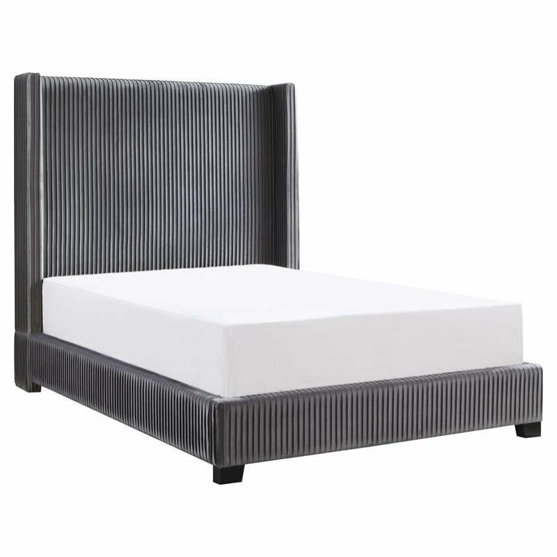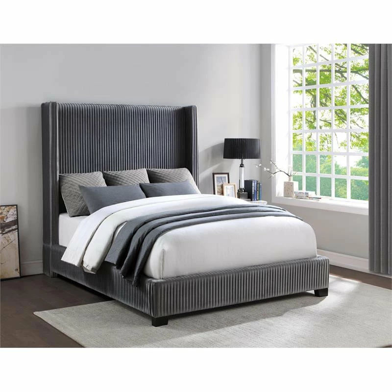 The stately profile of the Glenbury Collection will provide a dramatic statement to the design of your bedroom. The fully upholstered Eastern King bed features pleated dark gray velvet covering and mansion shelter headboard, creating a modern traditional look that defines your personal style.