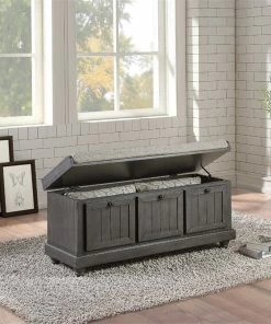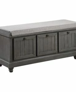 The Woodwell Collection will be a functional addition to your home. False drawer fronts serve as the base for this lift-top storage ottoman. A neutral tone grey padded seat provides a comfortable spot to sit as you prepare for your daily outings. Knob hardware create contrast to the antique gray distressed finish.