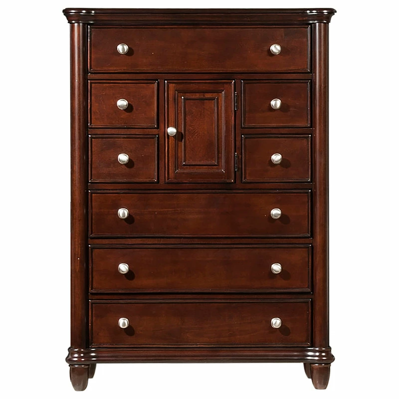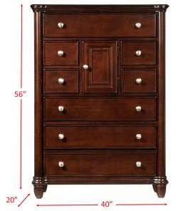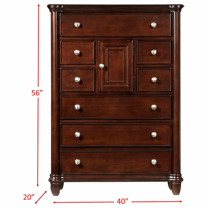 The Picket House Furnishings Gavin 8-Drawer Chest is the perfect addition to your bedroom! This vertical chest comes with eight, spacious drawers in various sizes. The chest also comes with a sizable chest, giving this traditional chest an updated look. The bottom drawer features a dust proofing layer to help protect your belongings. The silver finish drawer knobs complement the beautiful cherry finish perfectly. Bevel edges and tapered feet complete the look of this traditional design.