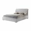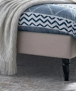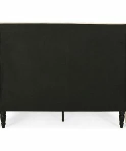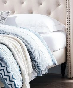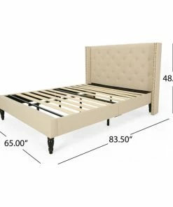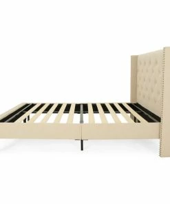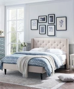 An elegant homage to traditional convention, the headboard features shallow button-tufting, hand-placed nail head accents, and classic turned legs – the low profile of the platform is juxtaposed with a high-back headboard and sophisticated wings at either end. Provides adequate support for any box spring or memory foam mattress. Queen-size. Upholstered in creamy beige fabric.