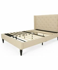 An elegant homage to traditional convention, the headboard features shallow button-tufting, hand-placed nail head accents, and classic turned legs – the low profile of the platform is juxtaposed with a high-back headboard and sophisticated wings at either end. Provides adequate support for any box spring or memory foam mattress. Queen-size. Upholstered in creamy beige fabric.
