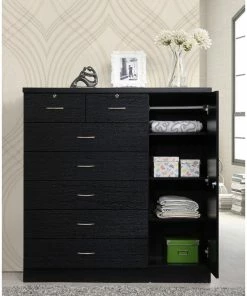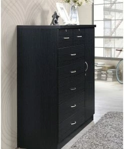 The Hodedah Seven Drawer Chest strikes a perfect balance between your storage as well as design requirements. It is constructed out of wood and is available in multiple finishes to choose from. This chest has seven drawers out of which two have locks and each drawer comes with extra support, which can handle extra weight. There is also a door when open reveals shelves and hanging rod for extra storage space. This chest has ample space on the surface top to showcase a photo frame, an antique clock, and a vase. This chest fits perfectly into any home decor. The Seven Drawer Chest by Hodedah has a clean and simple design making it easier for you to place it anywhere.