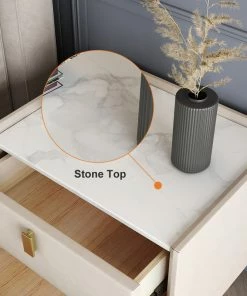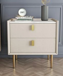 - The piece is made of environmentally friendly materials, has two pinewood drawers, a natural stone top, and four metal legs in a sleek design and a popular modern style.