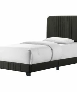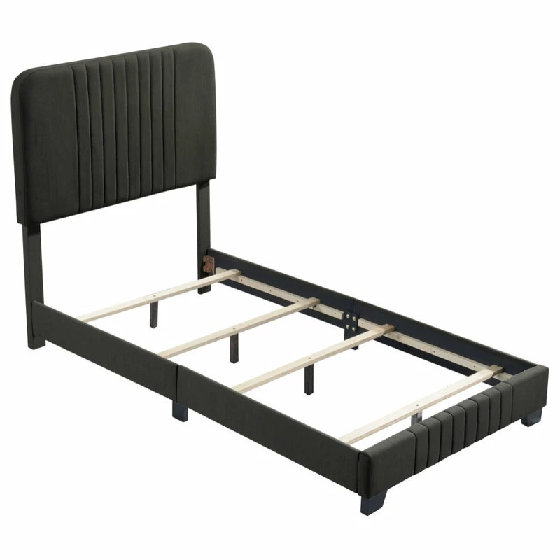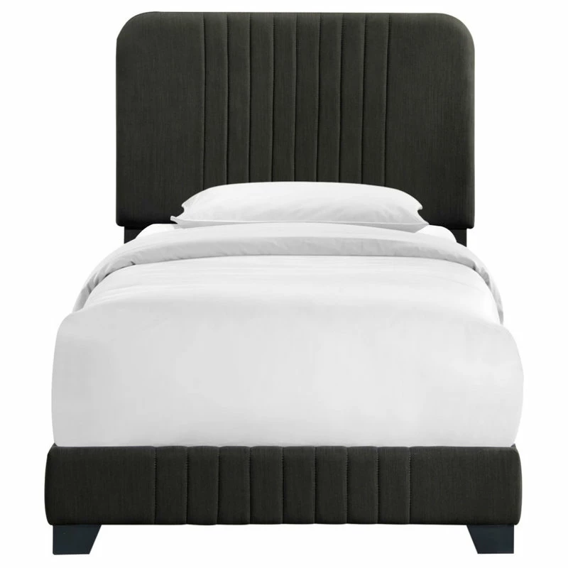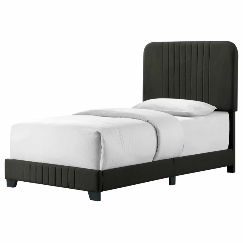 Rest your eyes on this soothing bed, which takes its cues from mid-century modern design. Channel stitch detailing and rounded corners define the headboard, which is covered in soft, durable Dupree Delft fabric. The steel Gray color adds a calming tone to any bedroom. A low-profile footboard with matching channel stitching and side rails complete the look. Solid rubberwood legs and wood slats make for a stable, strong bed, while the adjustable headboard height allows for adjustments based on your mattress and box spring height. Some minimal assembly required. Available in twin, full, queen and king sizes.