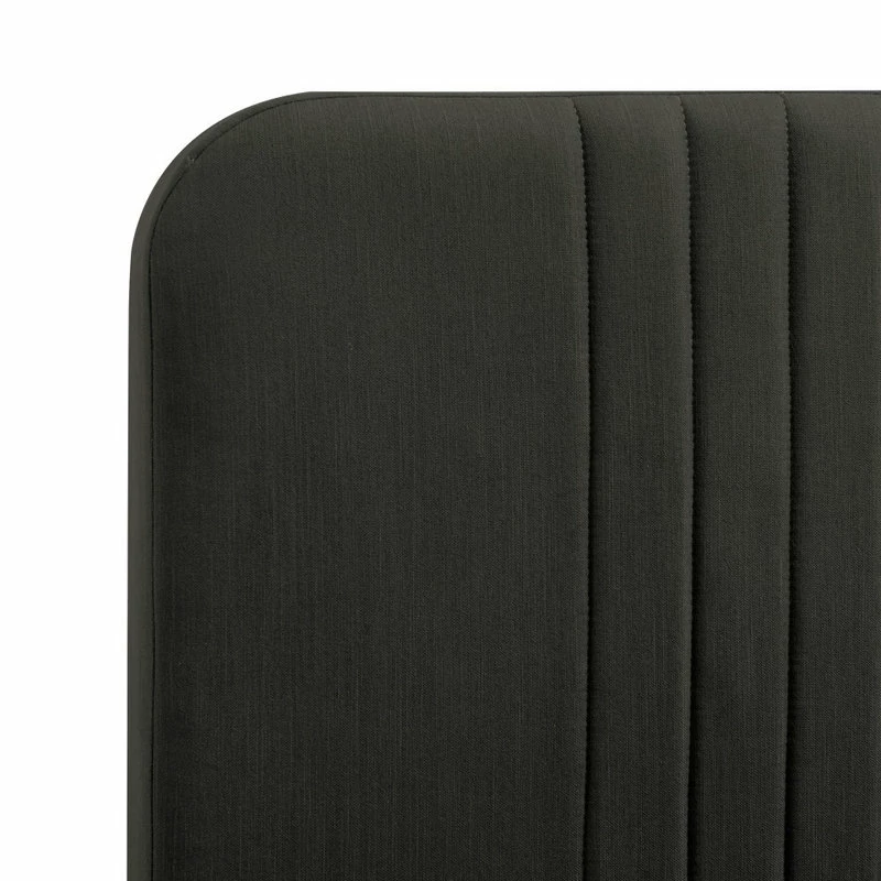 - Mid century styled bed with rounded corner headboard panel and channeled stitch detailing in the headboard and footboard