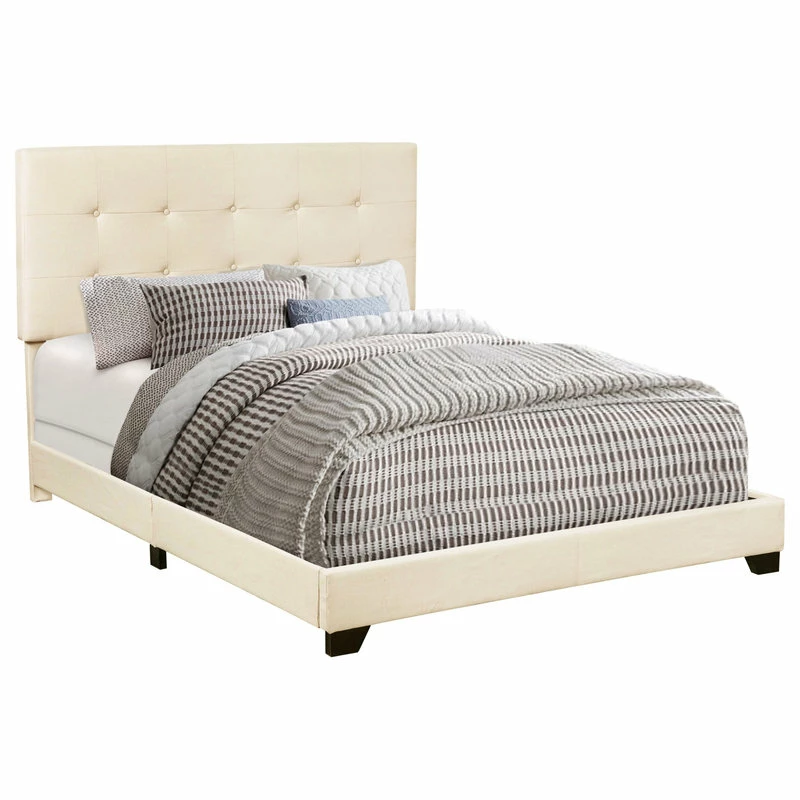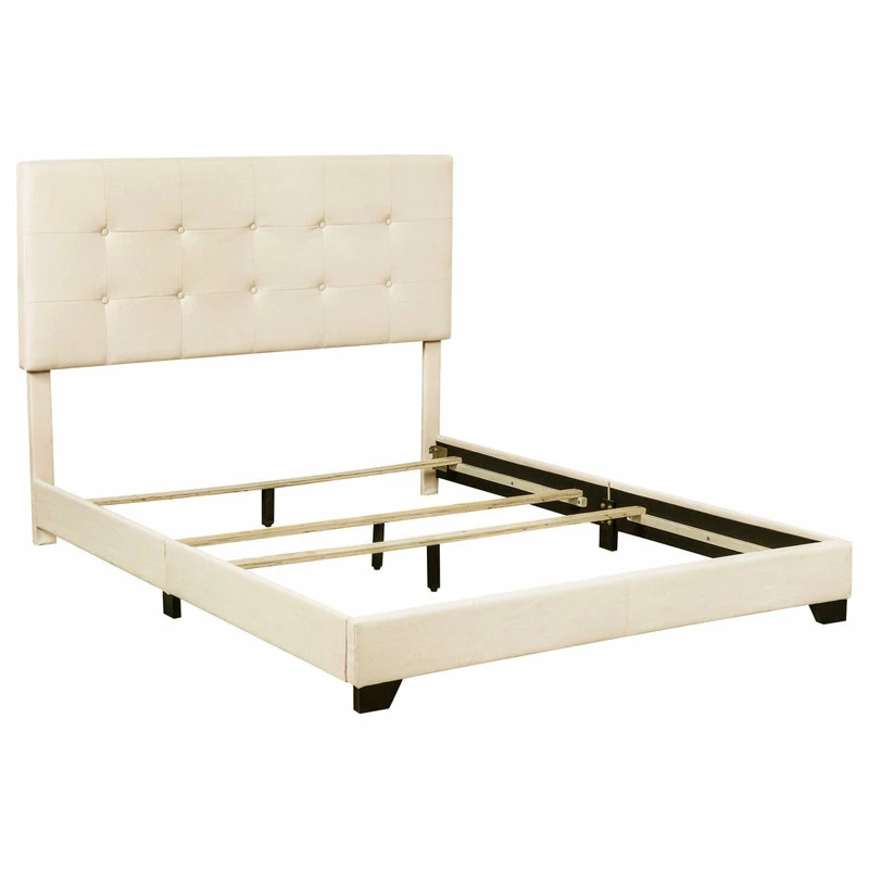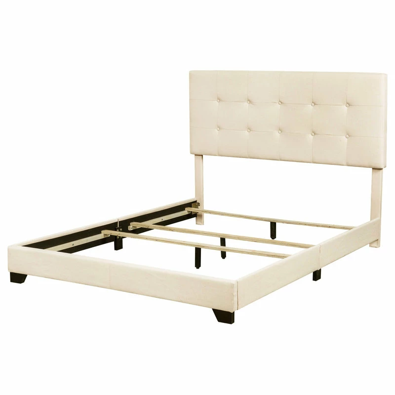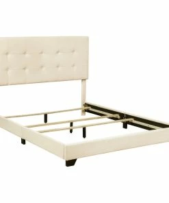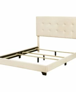 You can’t go wrong with this tasteful queen upholstered bed. Its simple lines, biscuit button tufting, and versatile cream upholstery are classic, yet modern. The low-profile side rails and footboard are welcoming and practical. The padded headboard is built with durability in mind and offers a comfortable spot for reading a book or watching the morning news. Recommended for use with a queen-size boxspring and mattress (not included).
