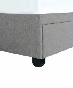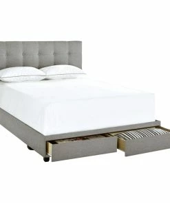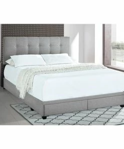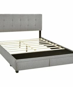 This platform storage bed is both stunning and functional. The headboard features biscuit tufting complimenting the gray linen-like fabric. Follow the fabric wraped side rails to the foot of the bed where you๏ฟฝll find two drawers for storage. A wooden slat roll with legs supports your mattress and box spring. The headboard adjusts for a variety of mattress heights. Assembly required.