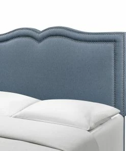 This dreamy upholstered Full bed is all about understated elegance. The headboard features a soothing blue fabric, accented with two rows of brushed nickel nail head trim for a touch of traditional charm. The gently sloping shape offers a soothing silhouette for the bedroom, while light padding ensures comfortable support.