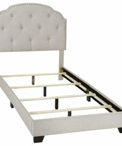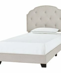 This dreamy upholstered Twin bed is all about understated elegance. The headboard features a neutral cream fabric, accented with a row of antique bronze nail head trim and button tufting for details of traditional charm. The gently sloping shape offers a soothing silhouette for the bedroom creating peaceful relaxation, while light padding ensures comfortable support.