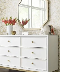 6 Drawers Finish: White with Gold Accents Hardware: Soft Gold Finished Knobs Material: Select Hardwoods, Poplar Solids and Paint Grade Veneer (CA CARB P2 Compliant)Drawer Construction: English Dovetail Fronts, Lap Joint Backs, Dust Bottom on Lowest Level Drawer Guides: Side Mounted, Ball-Bearing Drawer Guides Rachael’s Chelsea youth collection is a glamorous, sophisticated grouping that brings her fashion-forward taste to any age. From storage to sleep to study, these modern, intriguing pieces will be loved from a young age to a college dorm room. The clean, transitional lines of the white finish are offset with gold accents and Soft Gold Finish Knob hardware, making each piece as warm and inviting, as it is stylish.
