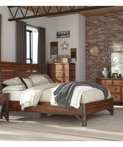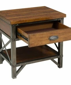 Heavily influenced by industrial design, the Dayton Collection will lend a unique look to your personal space. Metal finished framing provides sturdy structure and profile to each piece in this collection. Faux rivets provide additional detail to the metal finished bracketing that is prominently on display. The low profile bed features a horizontal slat design reminiscent of the industrial weathered environment that inspired the design. A rustic brown milk crate finish is utilized to highlight the acacia veneer. The open base nightstand provides drawer storage as well as an open display shelf.