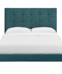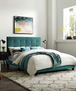 Clean lines, a straightforward profile, and classic button tufting define the Melanie Queen Platform Bed. Designed with chic elegance and contemporary style, Melanie’s base and headboard come upholstered in luxurious stain-resistant performance velvet, while the sturdy wood frame and legs offer lasting durability. Eliminating the need for a box spring, this platform bed is complete with a wood slat support system and reinforced center beam creating the perfect mattress foundation for memory foam, spring, latex, and hybrid mattresses. A sleek and sophisticated centerpiece to a kid’s bedroom, guest room or dorm, effortlessly transform bedroom decor with the luxe look of this modern platform bed. Includes non-marking foot caps. Bed Weight Capacity: 800 lbs.