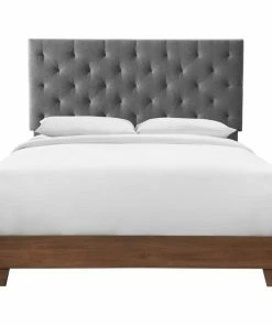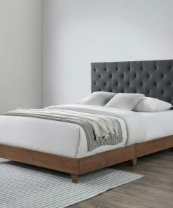Manifest the extraordinary in your bedroom decor with the Rhiannon Tufted Upholstered Fabric Queen Bed. Solidly constructed from MDF and wood, Rhiannon Queen Bed has tapered legs and a walnut veneer. Rhiannon�s sturdy frame comes with dual support planks, soft and durable polyester fabric upholstery, and a padded tufted diamond pattern headboard, for enhanced comfort and stability. Claim the elegance of Rhiannon Queen Bed for your master suite or guest room. This queen panel bed has a fixed position headboard, requires assembly and box spring. Headboard included. Spot clean as needed. Bed Weight Capacity: 800 lbs.
