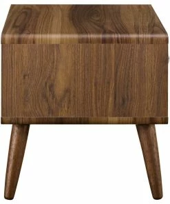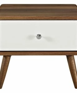 Harness the iconic energy of mid-century style with the Transmit Nightstand. Transmit features a full-extension white lacquer drawer with abundant storage, durable particleboard with smooth walnut grain veneer and four tapered wood legs. Display your favorite bedroom reading lamp, phone, keys, glasses, book, journal, and alarm clock on this contemporary nightstand. Transmit is also popularly used in the living room.