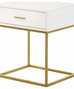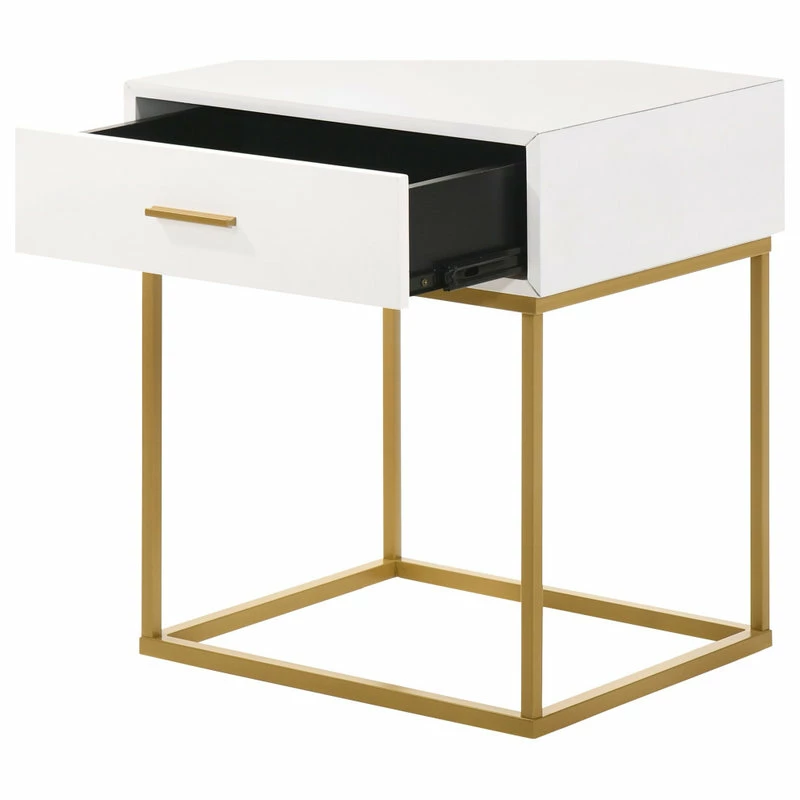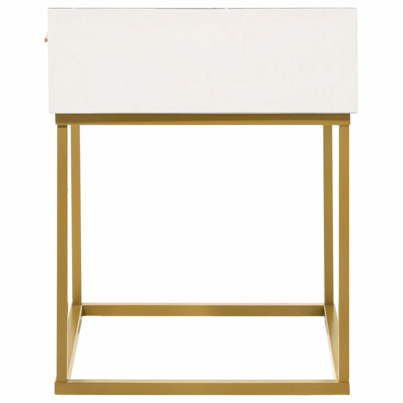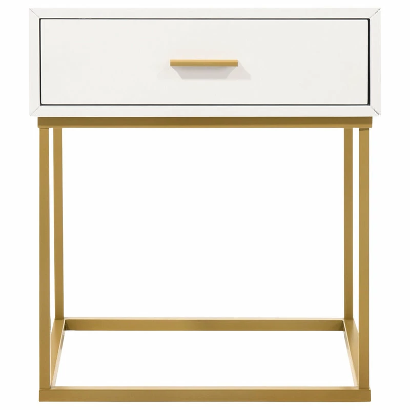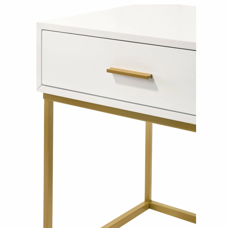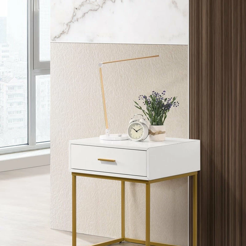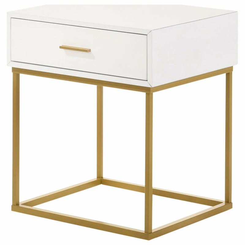 Created with a mixed material two-tone look, this one drawer nightstand is a striking choice for the transitional or contemporary bedroom. The nightstand is offered in four choices of colors: white, black, oak veneer and navy velvet fabric. Created to bring a dynamic style to master of guest suite, it features one storage drawer and a simple pull. Choose from black and gold metal leg finishes.