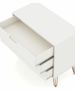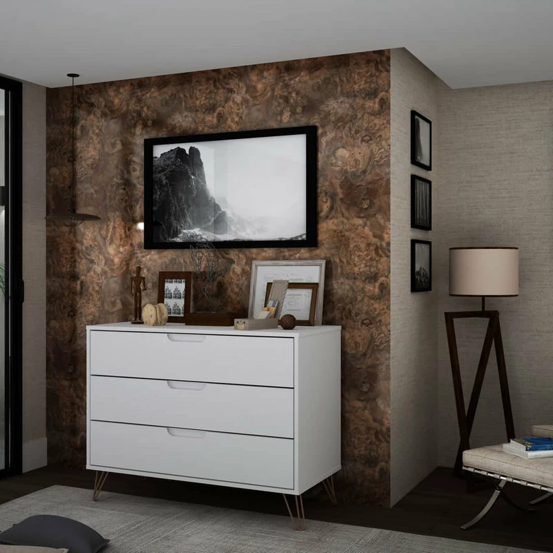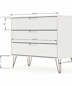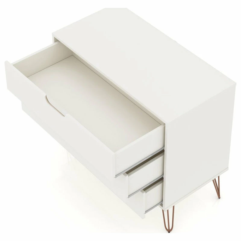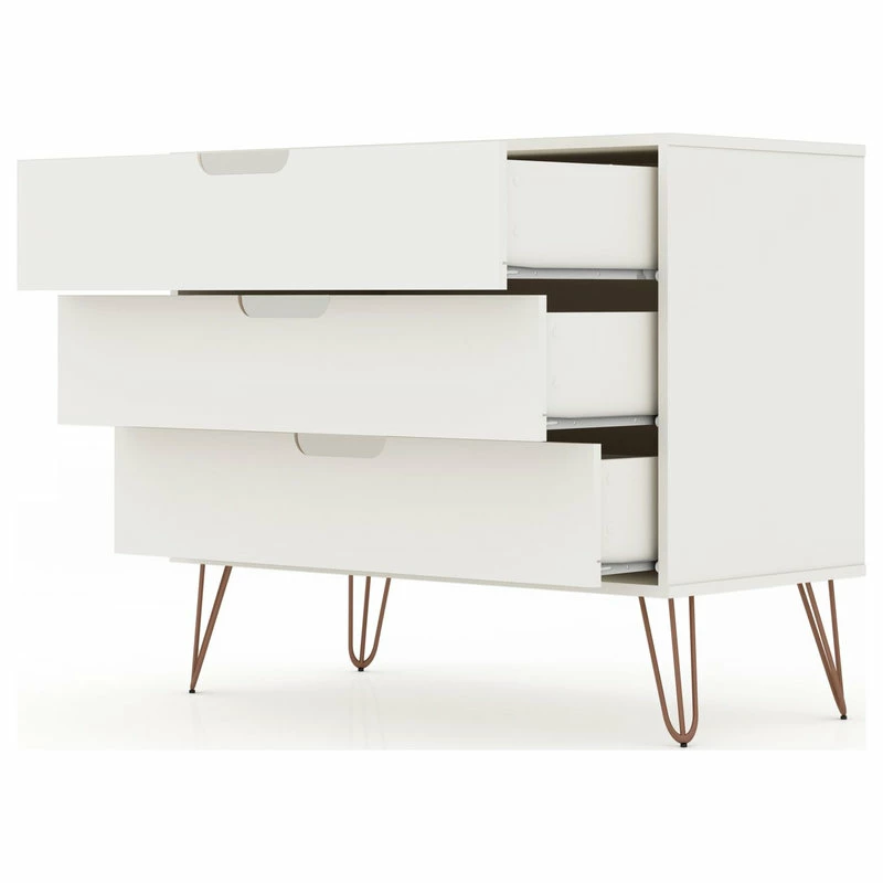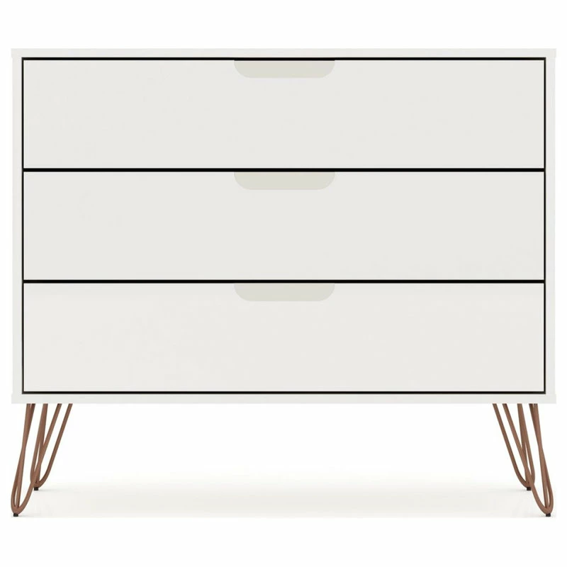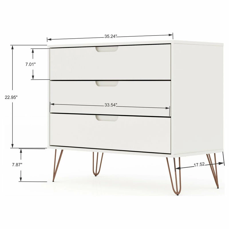 The Rockefeller dresser is the perfect accompaniment to any bedroom space, with ample storage and minimalistic Mid-century modern style. Cutout handles keep the piece feeling fresh with three drawers made easy for stowing away clothing, personal items, and beyond. A display top allows for sharing favorite framed family photos, travel trinkets, perfume trays, or a decorative lamp. Set it under a mirror or painting to complete your space with this instant bedroom focal point. Dimensions: 35.24 in. Length, 28.86 in. Height, 17.52 in. Depth.
