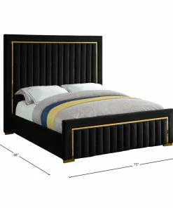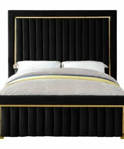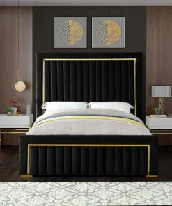 Ensconce yourself in regal modernity in this Dolce Black Velvet Queen Bed. A super tall headboard makes this Dolce bed hard to ignore, ensuring it is the focal point in your bedroom sanctuary. The padded headboard is plump and welcoming, making it ideal for propping up against while you read the daily news or watch some TV. Gold trim and channel tufting add to the headboard’s luxurious look, lending it an air of regality and upscale refinement. The black velvet upholstery is buttery-soft and lavish to the touch, making you feel like royalty with every nap.