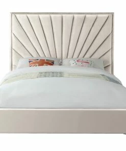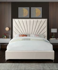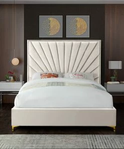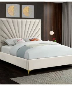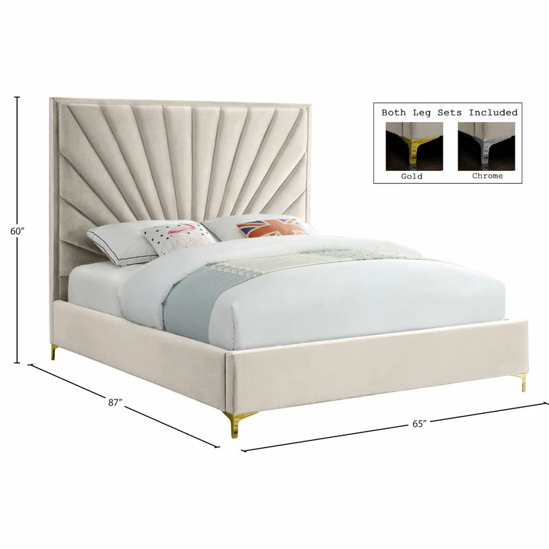 Turn up the wow factor in your bedroom with this Eclipse Queen Bed from Meridian Furniture. Stunning velvet upholstery in a posh cream color brings rich elegance and style to your space. A fan-like shell pattern on the headboard is achieved with channel tufting, which keeps the padded headboard plump and full, so it supports your back while you sit up in bed, binging on your favorite shows. Metal legs finish off this bed’s luxe look, giving it a modish slant.