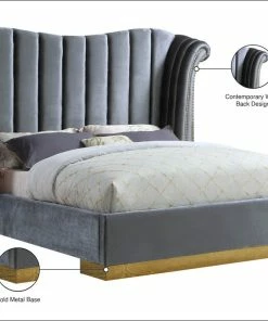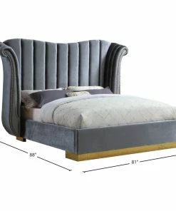 Make a dramatic statement while creating contemporary flair in the bedroom with this breathtaking Flora grey velvet queen bed. Featuring a gold metal base upholstered with rich grey velvet with gold nailhead accents and channel tufting along the headboard, this gallant bed is sure to command the attention of anyone who enters your bedroom chamber. Its contemporary wing-back design adds a regal presence to your sleeping space, while its generous size ensures you sleep like a king.