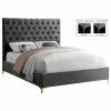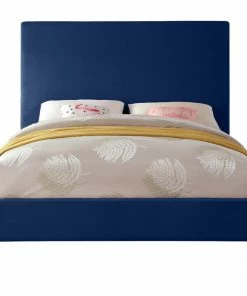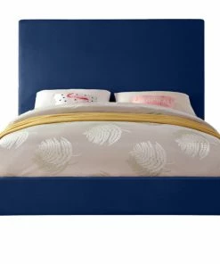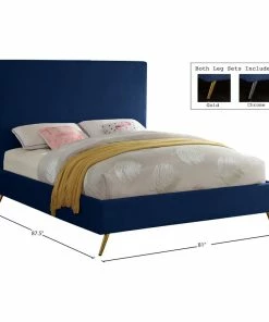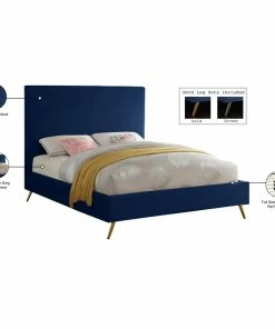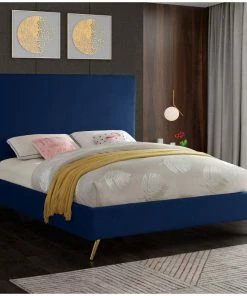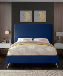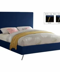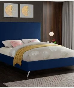 Embolden your bedroom space with this beautiful and colorful Jasmine Navy Velvet King Bed. A pop of stunning color and chic, sleek velvet upholstery set this bed apart as a distinctively elegant option for your bedroom sanctuary. The contemporary design meshes well with modern dรฉcor, making it the ultimate choice for the uber-modern home. Metal legs with a retro slant lend this bed a finished look. Because the bed requires no box spring or foundation, it offers a svelte, minimalist profile.