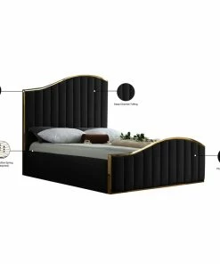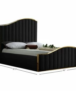 Transform your bedroom into a dream haven with the breathtaking Jolie black velvet queen bed. Featuring a stunning polished gold metal frame that supports black velvet upholstery on the headboard and footboard with channel tufting for texture, this sleek bed not only commands your attention, it demands it. The wavy design of the headboard and footboard evokes a dramatic image reminiscent of a boat rolling on the waves at sea, promising to lull you to sleep and reward you with a night of pleasant dreams.