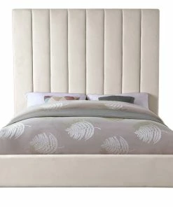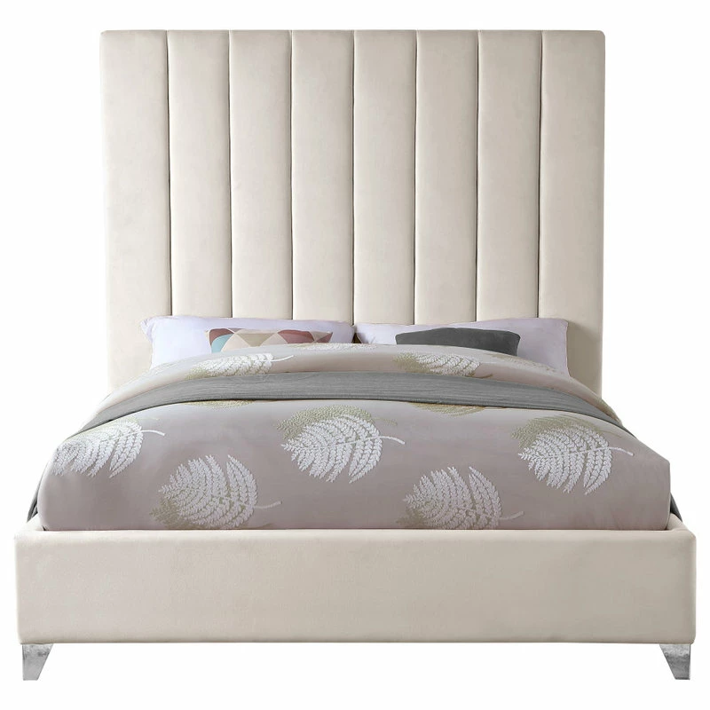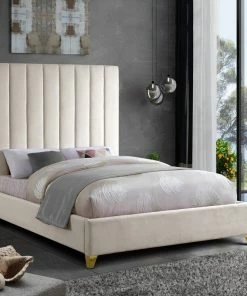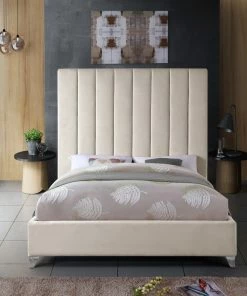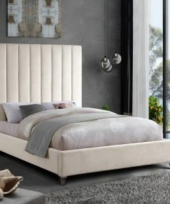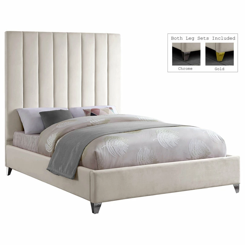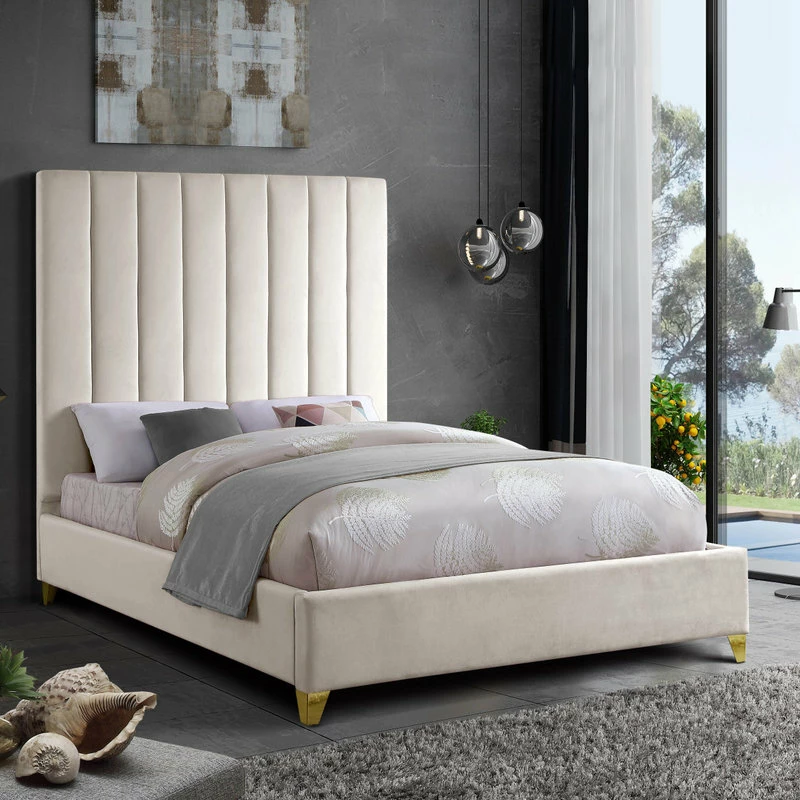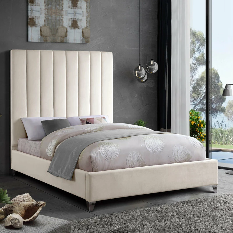Take the look of your bedroom to new decorative heights with this ultra-modern Via full upholstered bed. Cream velvet upholstery gives this bed a true upscale feel and epitomizes fine living while channel tufting along the headboard keeps the padded material inside plump and aloftโso it cradles your body while you sit up in bed to watch TV or read. Metal legs bring this platform bed up off the floor, allowing clearance below for cleaning and adding to its svelte contemporary profile.