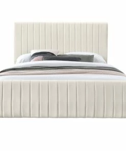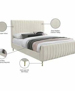 Slip into the lap of luxury with this Zara Velvet Bed. This beautiful king bed is padded to the max on its headboard and footboard for a look that is nothing short of upscale. The luxe design is amplified by the bed’s rich cream velvet upholstery and its deep detailed channel tufting, which also serves to keep the interior padding aloft, full, and comfortable while you relax or unwind in bed. The bed has gold legs for a regal touch, and it comes with slats, so it doesn’t require a box spring.