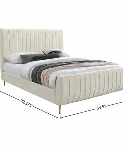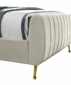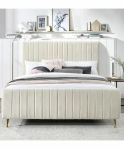 Slip into the lap of luxury with this Zara Velvet Bed. This beautiful queen bed is padded to the max on its headboard and footboard for a look that is nothing short of upscale. The luxe design is amplified by the bed’s rich cream velvet upholstery and its deep detailed channel tufting, which also serves to keep the interior padding aloft, full, and comfortable while you relax or unwind in bed. The bed has gold legs for a regal touch, and it comes with slats, so it doesn’t require a box spring.