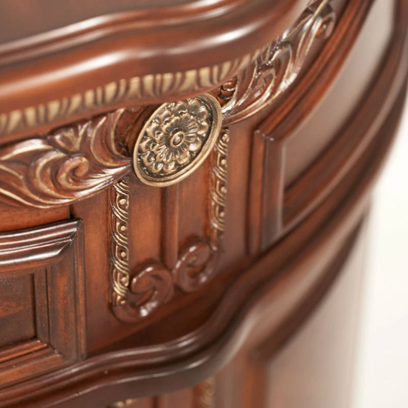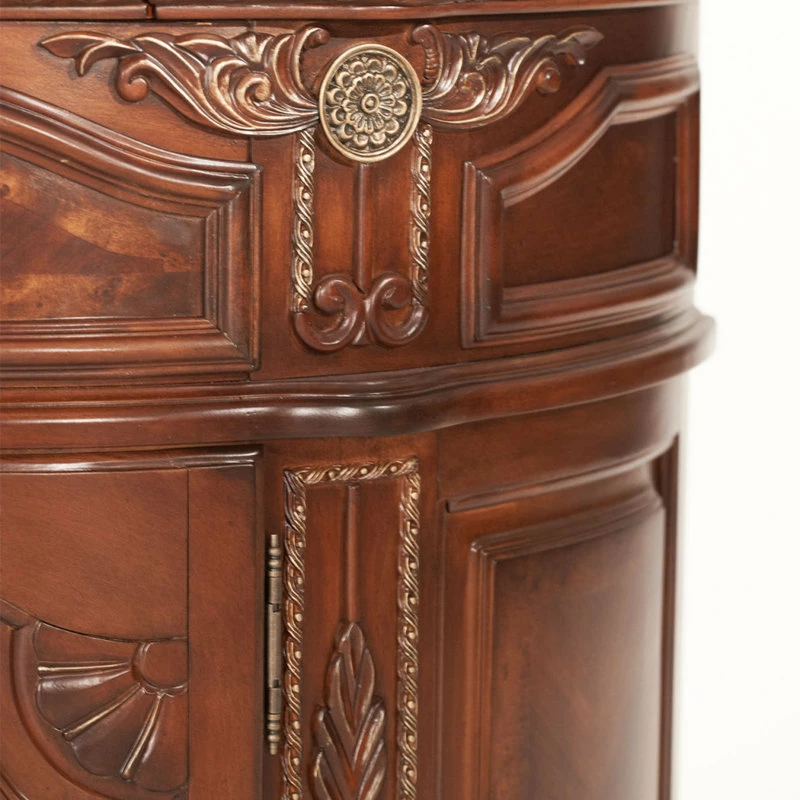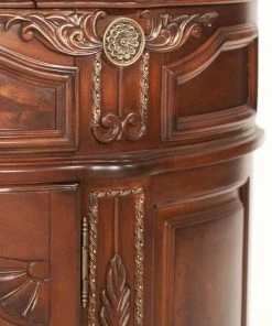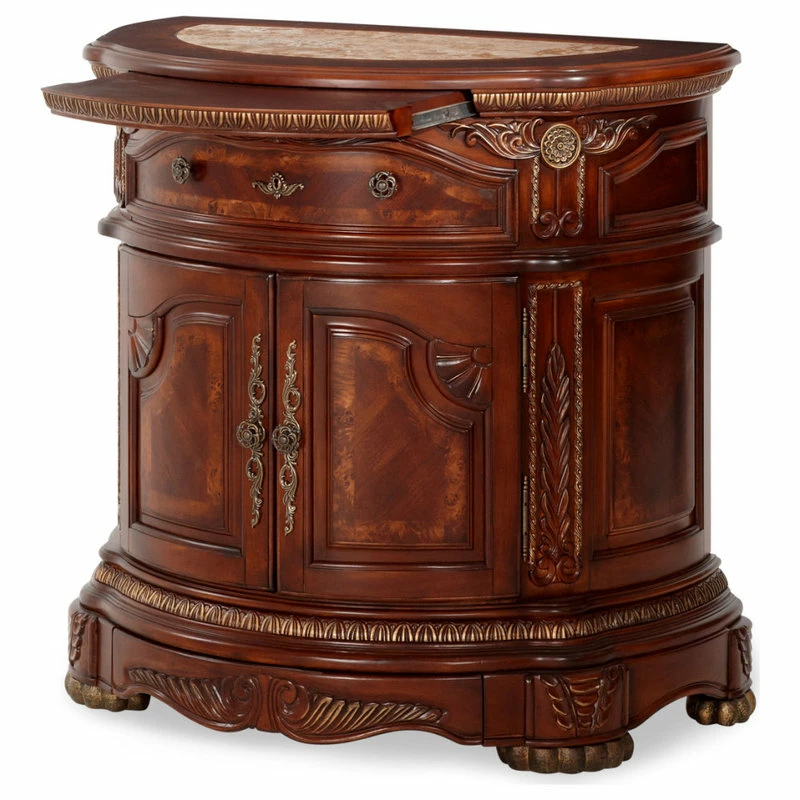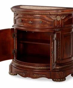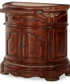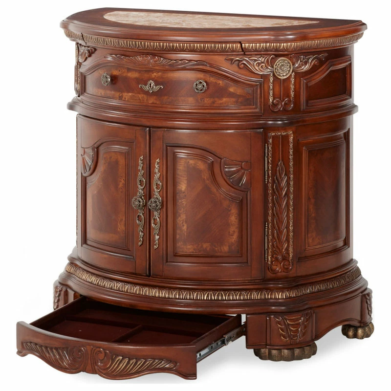 - Nightstand contains a drawer, pull-out tray and cabinet, plus a hidden velvet lined jewelry cache at the base