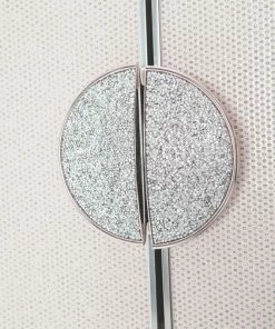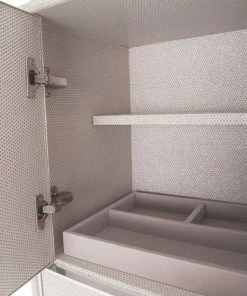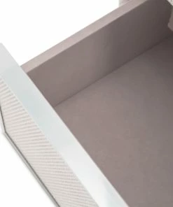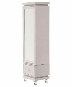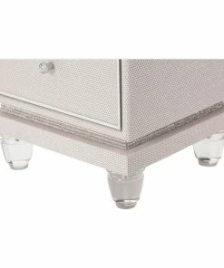 The swivel lingerie chest features a stainless steel medallion as the focal design element, with crushed crystallized facets. Drawers are framed with stainless steel and the piece is fully upholstered with high-quality glitter perforated vinyl in an ivory finish.