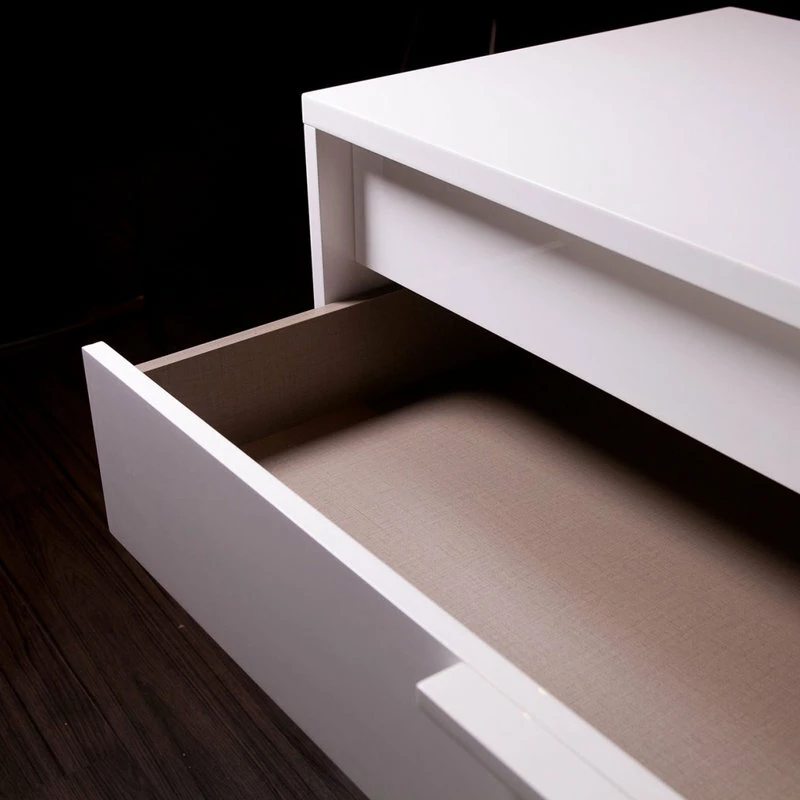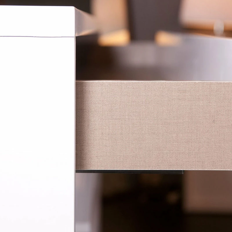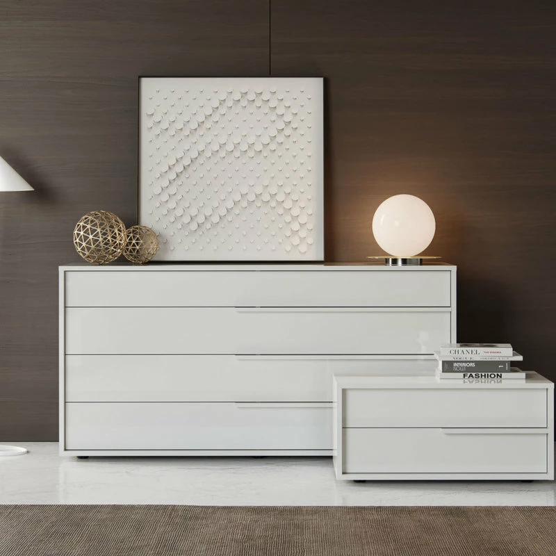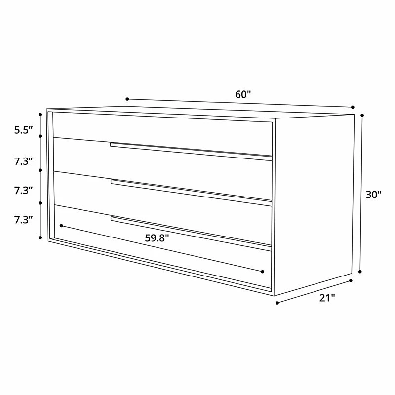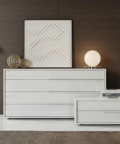 The Jane four-drawer dresser features generous proportions and sleek design accentuated by thin handpulls. Push-open top drawer sized for smaller personal belongings, while pull-out bottom drawers sized for larger bedroom storage. Soft-closing glides enable smooth and effortless drawer movement. Interior of drawers elegantly lined in linenboard to complement its exterior. Complementary nightstands available.