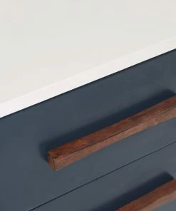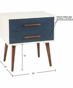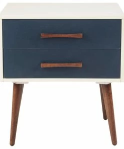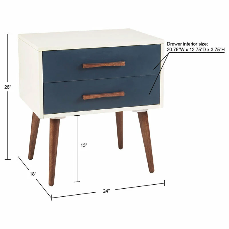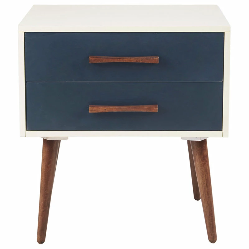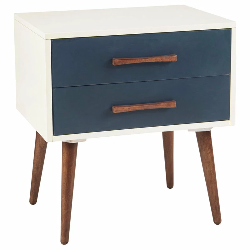 - Wood Finish: Off-White body, Dark Navy Blue drawer front / Pecan leg and handle