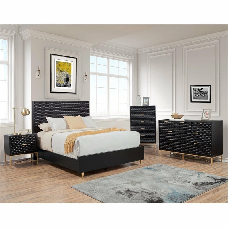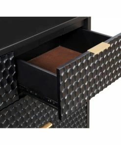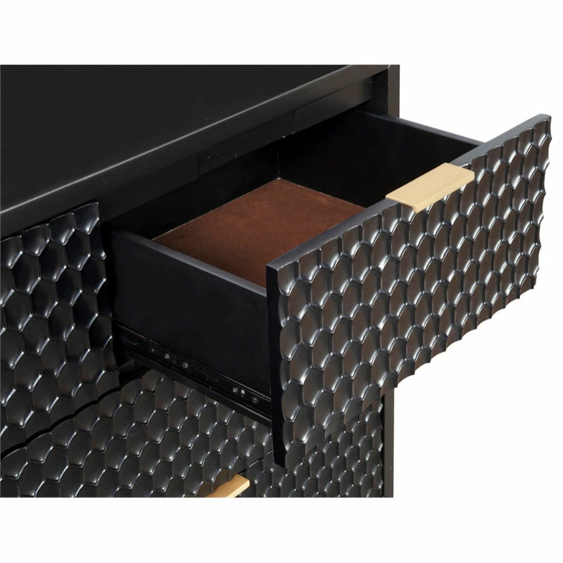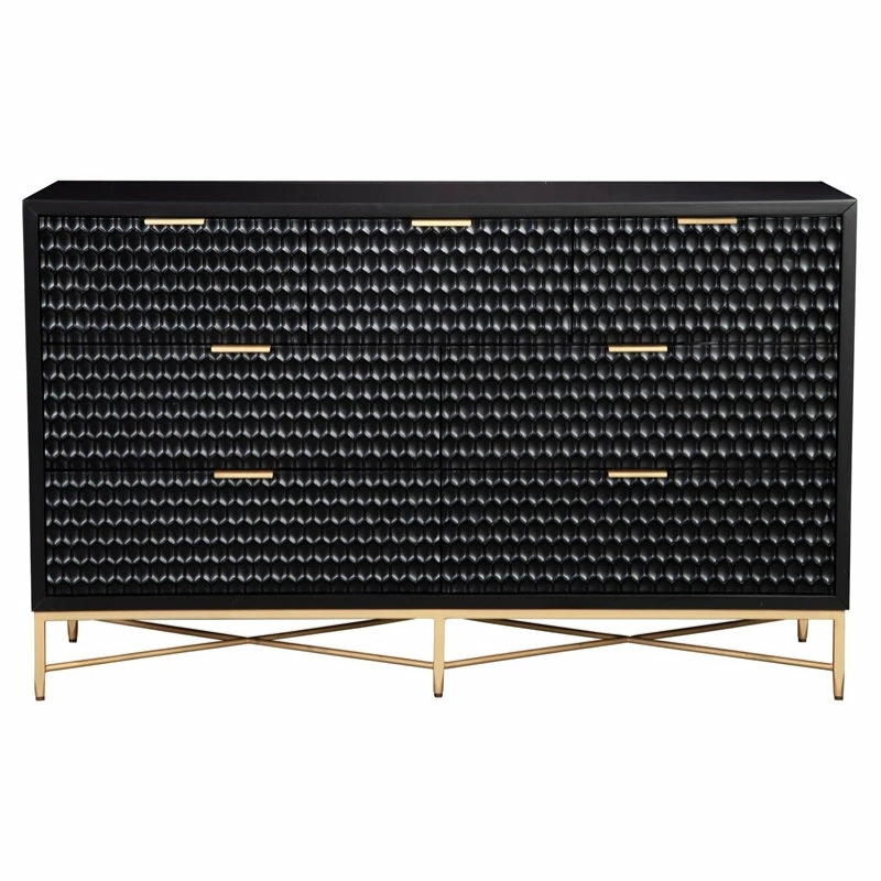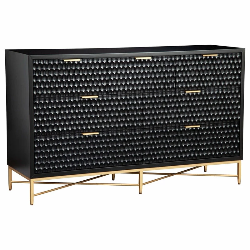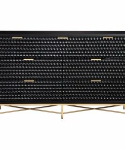 Todayβs Contemporary, the Black Pearl Dresser stands out in any bedroom. With 7 drawers, this piece provides tremendous storage. The top 3 drawers are felt lined to protect your fragile possessions, keeping items in place as you open and close the drawer. Distinctive textured drawer fronts with gold handles are bordered by Mahogany solids and veneers. The gold metal base gives the piece an open, off-the-floor look and simplifies cleaning. Coordinates with other pieces from the Origins by Alpine White Pearl and Black Pearl bedroom collection sold separately.