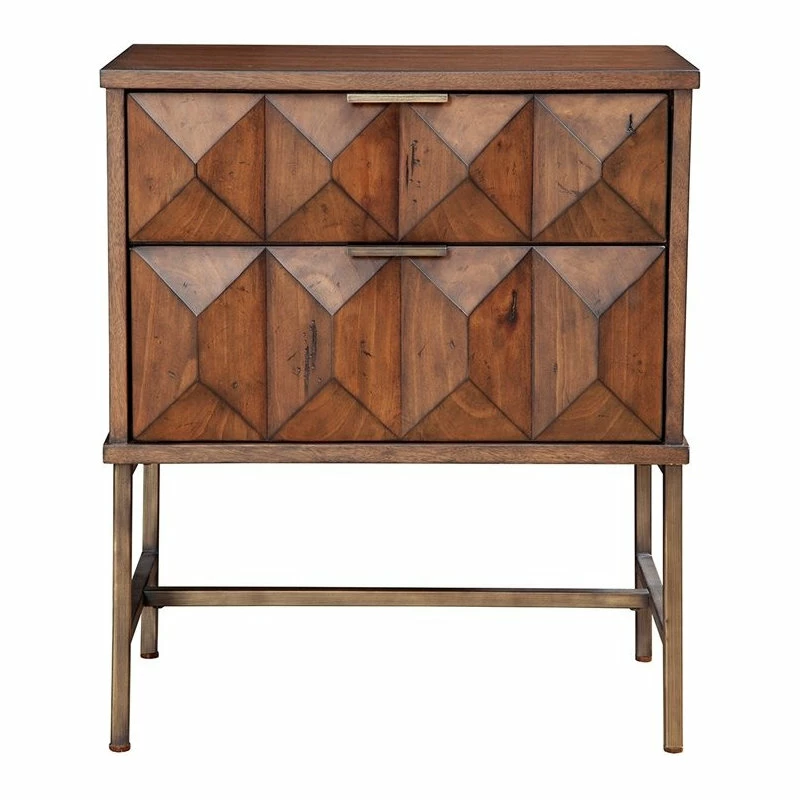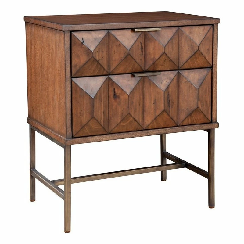 Dramatic Urban Contemporary, the Trig Nightstand will be the highlight of any bedroom. With clean lines, the piece features 2 storage drawers with geometric forms on the drawer fronts. Pine solids and veneers are blended with an aged brown finish and accented by bronze hardware. The bronze metal base gives the piece an open, off-the-floor look and simplifies cleaning. Coordinates with other pieces from the Origins by Alpine Trig bedroom collection sold separately.