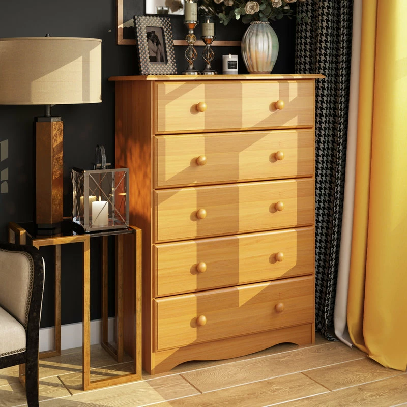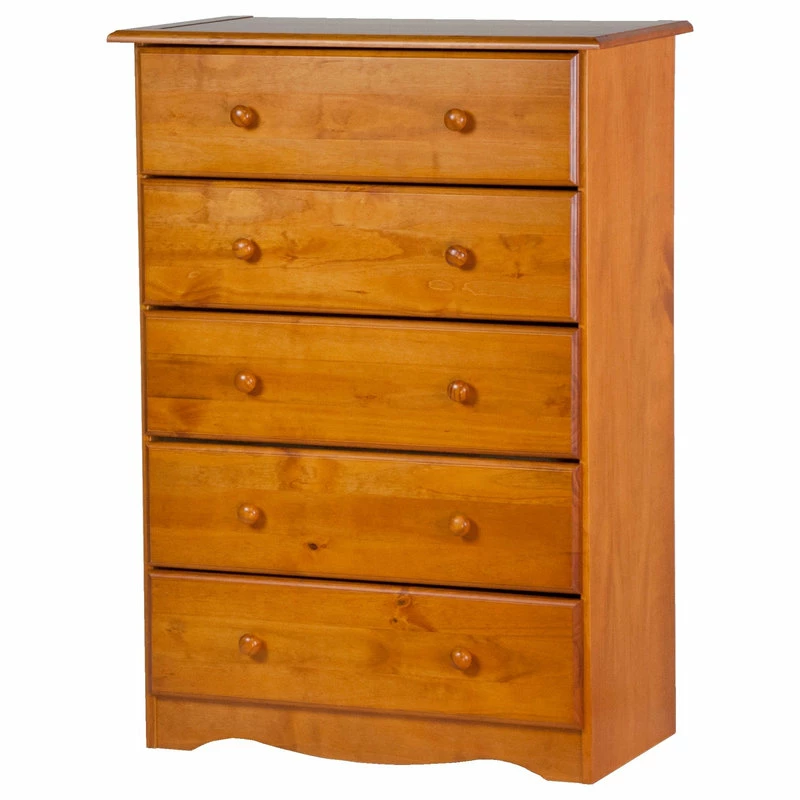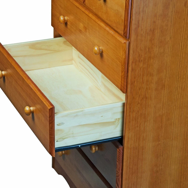 The redesigned 5-drawer chest meets the new CPSC tipover safety regulations and now features solid wood back panels which replaced plywood. Framed top prevents hairline cracks and boasts the appealing grooves. Metal Euro glides with safety stops offer smooth operation while plywood drawer bottoms can hold substantial weight. Itβs well-engineered, sturdy and functional. Made entirely of solid pine wood and hand painted, the chest is aesthetically pleasing, silky smooth and practically knot-free. Available in 4 finishes, it will be compatible with many design ideas and interiors or you can choose from other matching in color and style furniture pieces designed by Palace Imports.